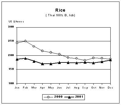 Large domestic supplies from the excellent 2001 crop continued to exert strong downward pressure on rice quotations in the United States. As a result, most prices of rices from the United States fell between November and January, including the price of the higher quality, long grain rice N. 2/4, which dipped from US$214 per tonne to US$208 per tonne.