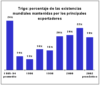 Ahora se pronostica que al cierre de las campañas que terminan en 2002 las existencias mundiales de trigo alcanzarán los 211 millones de toneladas, 11 millones de toneladas más que el pronóstico de diciembre pero todavía 26 millones de toneladas, equivalentes al 11 por ciento, menos que sus niveles de apertura. La merma prevista en las existencias de trigo de fin de campaña en China absorbería la mayor parte de la dis-minución de un año a otro de los remanentes mun-diales. Además, ahora se pronostica que las existen-cias totales de trigo de los principales países exporta-dores disminuirán 11 millones de toneladas a 41 millo-nes de toneladas. La disminución es inferior en 4 millo-nes de toneladas de lo pronosticado anteriormente, debido principalmente a los ajustes al alza efectuados este mes a los números de Australia y la CE.