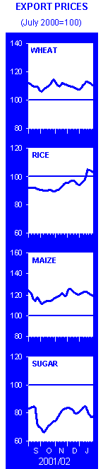 Global cereal output in 2001 is provisionally estimated at 1 880 million tonnes (including rice in milled terms), slightly up from the forecast in December and 1.2 percent up on the previous year. However, with global cereal utilization in 2001/02 still forecast to be well above this level at 1 935 million tonnes, the global cereal stocks will be drawn down significantly. While overall food supply prospects for 2002 are more favourable than in the past two years, millions of people in developing countries still need emergency food assistance due to natural and man-made disasters (see box on page 6). Early indications point to a larger global wheat crop in 2002 as some northern hemisphere countries have reported larger winter plantings and a general recovery in yields is expected in many regions after drought in 2001. Weather conditions for the first 2002 coarse grain crops are generally favourable in southern Africa but unfavourable in parts of South America. The main northern hemisphere crops are yet to be planted. Prospects for the 2002 paddy crops in the southern hemisphere are uncertain in the light of less than ideal weather in several countries. World cereal trade in 2001/02 is forecast at 236 million tonnes, 2 million tonnes above the previous year. Imports of wheat and rice are forecast to increase by 4 million tonnes and 1 million tonnes respectively, more than offsetting a 2 million tonnes decline expected for coarse grains. International wheat prices remain largely unchanged since the last report, while those for coarse grains weakened slightly. In general, grain prices remain mostly below those at the corresponding time in the previous season, reflecting abundant market supplies, even if not from the traditional major exporters. International rice prices showed some signs of recovery over the past two months but continue to show significantly divergent trends according to type and origin. Growth in meat output in 2001 was the lowest in two decades, largely the result of animal disease outbreaks and sluggish economic growth during the year. Trade also stagnated, the year being marked by market disruptions and trade diversion. International meat prices, as represented by the FAO index, dropped 2 points over the course of the year, despite strong gains for meats other than beef. World fish production in 2000 increased to a record 130 million tonnes. Total world trade in fish and fishery products in 2000 (in export value) also increased, rising 3 percent over the preceding year's level. |
