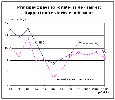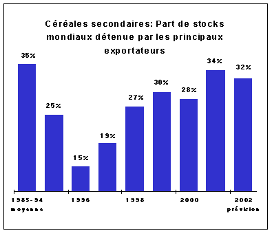 Les stocks de céréales secondaires détenus par les principaux exportateurs tomberont vraisemblablement à 72 millions de tonnes, soit 9 millions de tonnes de moins que pendant la campagne précédente. À ce niveau, dans les principaux pays exportateurs, le ratio stocks /écoulement total devrait tomber à 16,3 pour cent en 2001/02, contre 18,4 pour cent en 2000/01. Cette diminution devrait surtout être imputable à la contraction des stocks aux États-Unis, qui sera probablement entraînée par le fléchissement de la production en 2001. En revanche, dans la CE, les stocks de céréales secondaires devraient augmenter pour la troisième année de suite, surtout en ce qui concerne le seigle, qui soutient de moins en moins la concurrence de l'orge et du blé.