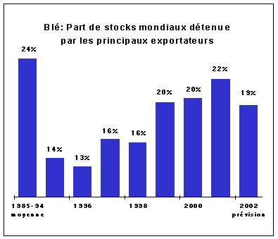 Selon les prévisions actuelles, les stocks mondiaux de blé, à la clôture des campagnes prenant fin en 2002, devraient s'élever à 211 millions de tonnes, soit 11 millions de tonnes de plus que le chiffre prévu en décembre, mais encore 26 millions de tonnes de moins (11 pour cent) que leur niveau d'ouverture. L'amenuisement des stocks mondiaux de report d'une année sur l'autre s'expliquerait principalement par la diminution probable des stocks de clôture en Chine. De même, le volume global des stocks de blé détenus dans les principaux pays exportateurs devrait, selon les prévisions actuelles, baisser de 11 millions de tonnes pour être ramené à 41 millions de tonnes. Cette baisse est moins forte (d'environ 4 millions ) que celle qui était prévue antérieurement. La principale raison, est que les chiffres de la production de blé de l'Australie et de la CE en 2001 ont été révisés en hausse ce mois-ci.