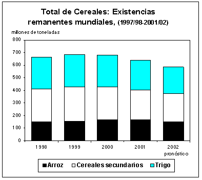 El pronóstico relativo a los remanentes mundiales de cereales para las campañas agrícolas que terminan en 2002 se ha aumentado a 587 millones de tonela-das, 34 millones más que el informe anterior pero aún así 55 millones de toneladas, equivalentes al 8 por ciento, menos que el volumen de la campaña anterior. La disminución de la presente campaña deberíase principalmente a una mengua de las existencias de China debida a una reducción de las cosechas de trigo y arroz. El aumento del pronóstico de este mes se debe a un incremento mayor del previsto de las existencias acumuladas en la India, la Federación de Rusia y Ucrania, a la vez que se prevé también un aumento de las existencias en Australia y la CE.