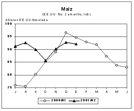 La evolución de los precios internacionales del maíz también mostraron una tendencia semejante a la del trigo, dada la situación muy semejante de la oferta y la demanda de ambos productos. El aumento de la pro-ducción mundial de maíz y la cuantía extraordinaria de los suministros exportables de algunos de los exporta-dores no tradicionales, como el Brasil, siguen pesando en el mercado. En enero, las cotizaciones del precio de exportación del maíz amarillo No. 2 de los Estados Unidos alcanzó un promedio de 92 dólares EE.UU. por tonelada, 2 dólares EE.UU. más que en noviembre de 2001 pero inferior todavía al del período correspon-diente del año pasado. Si se tiene en cuenta el debili-tamiento de la demanda mundial, resultan también li-mitadas las perspectivas para cualquier incremento moderado de los precios en los próximos meses. En las últimas semanas, los valores del CBOT han des-cendido por debajo de los niveles de la campaña ante-rior, y al final de enero los futuros de mayo se cotiza-ron a 84 dólares EE.UU. por tonelada, más bajos todavía que el año pasado.