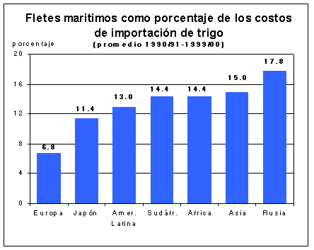 La importancia de los fletes internacionales en el costo total de la importación de cereales puede verse por el porcentaje medio de los valores unitarios de las importaciones atribuido a dichos costos en los años noventa. La mayor parte de los 15 países en desarrollo de los que se disponía de datos pagó en concepto de fletes en-tre 10 y 19 por ciento de sus costos totales de importaciones por unidad, mientras que un grupo de cuatro paí-ses pagó más del 20 por ciento. Los fletes correspondientes a los cinco países de bajos ingresos y con déficit de alimentos incluidos en el examen fueron de los más altos de todos los países examinados. En Bangladesh y el Sudán, por ejemplo, el porcentaje de sus valores unitarios de importación de trigo atribuido a los fletes era del 25 y 19 por ciento, respectivamente. En cambio, el promedio de los fletes de las importaciones de trigo de la CE representaba sólo el 6 por ciento del valor unitario de las importaciones.