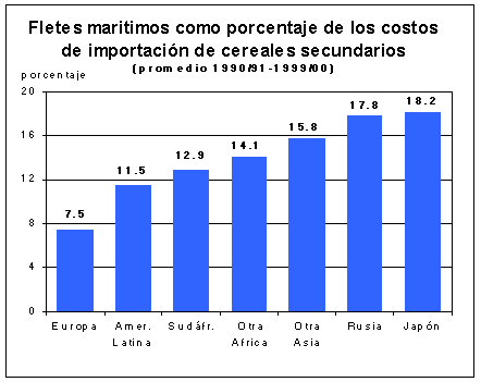 Los fletes absorbieron una parte significativa del valor del comercio internacional de trigo y cereales secundarios durante el decenio anterior. Aunque los fletes nominales de los cereales tendieron a bajar durante el decenio, en la mayoría de los países examinados siguieron absorbiendo una proporción grande de los costos de importación. Para muchos países, los fletes pueden significar una quinta parte de la facturación de sus importaciones de cereales. En el mercado competitivo de cereales que existe desde mediados de los años noventa los fletes pueden desempeñar un papel central en el volumen y la dirección del comercio cerealero.