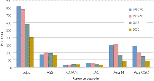 9. A pesar del crecimiento de la población, la proporción de personas que padecen hambre en los países en desarrollo disminuyó en un 3 por ciento en el decenio de 1990. Aunque este hecho representa un progreso, la prevalencia del hambre sigue siendo inaceptablemente alta. A principios del siglo XXI, en un mundo de visible abundancia, el 34 por ciento de los habitantes del África subsahariana padece hambre crónica (Figura 1). Esto significa que el número de personas subnutridas ha aumentado en 24 millones en un decenio.