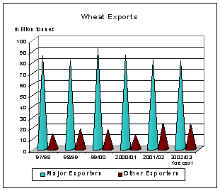 Regarding exports, the EC’s new status as a leading wheat importer (though still a net exporter) has not been the only important development of the current season. The prevalence of exceptionally large wheat surpluses in many countries this season is another. The 2001/02 season has been marked by a surge in wheat export availabilities in a number of Central and Eastern European Countries (CEECs) as well as Kazakhstan, the Russian Federation, Ukraine, India and Pakistan. Some of these newcomers were among the largest importers in recent years. Confronted with large supplies and limited storage facilities, most have resorted to exports as the remedy for a speedy liquidation of their domestic surpluses. The 2001/02 season has also been marked by the return of the Syrian Arabic Republic as an international supplier of durum after two years of absence, following a strong recovery in its domestic production. By contrast, among the traditional major exporting countries, only Australia is seen to increase its market share this season, while economic problems in Argentina have already taken toll on the pace of exports despite the sharp devaluation of the Peso. Meanwhile, wheat sales from North America are estimated to remain below the previous season’s volume, depressed by growing competition from other exporters.