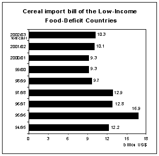 The combined cereal import bill of the Least-Developed Countries (LDCs) and the Net-Food Importing Developing Countries (NFIDCs), which include a list of nations agreed by the World Trade Organization (WTO) to qualify as beneficiaries under the Marrakech Decision on the Possible Negative Effects of the Reform Programme, is estimated at some US$6 billion in 2001/02. This is almost unchanged from 2000/01, as anticipated slight increases in imports across LDC countries would largely offset small declines among NFIDCs.