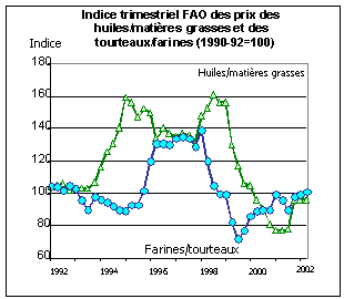 Dans le secteur des farines d’oléagineux, il est peu probable que la lente progression des prix amorcée à la fin de la dernière campagne se maintienne en 2001/02, même si le niveau actuel des prix, indiqué par l’indice FAO des prix des farines d’oléagineux, reste plus élevé qu’en 2001 à la même époque.