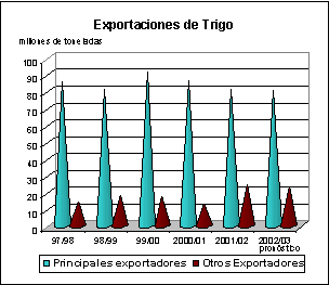Con respecto a las exportaciones, el hecho de que la CE haya pasado a ser uno de los principales importadores de trigo (aunque todavía sigue siendo un exportador neto) no ha sido la única novedad importante de la campaña actual. Otra es la existencia de cuantías excepcionales de excedentes de trigo en muchos países. La campaña de 2001/02 se ha caracterizado por el auge de las disponibilidades exportables de trigo en algunos de los países de Europa central y oriental, así como en Kazajstán, la Federación de Rusia, Ucrania, la India y el Pakistán. Algunos de estos nuevos allegados figuraban en los últimos años entre los importadores principales. En presencia de suministros abundantes y de limitadas instalaciones de almacenamiento, la mayoría ha recurrido a las exportaciones para liquidar rápidamente sus excedentes internos. La campaña de 2001/02 también se ha caracterizado por la vuelta de la República Árabe Siria como proveedor internacional de trigo duro tras dos años de ausencia, como consecuencia de una fuerte recuperación de su producción interna. En cambio, entre los principales países exportadores tradicionales, sólo se prevé un aumento de la cuota de mercado de Australia en la campaña actual, mientras que en Argentina los problemas económicos ya han frenado el ritmo de las exportaciones pese a la fuerte devaluación del peso. Entre tanto, se estima que las ventas de América del Norte estarán por debajo del volumen de la campaña anterior, debido a la creciente competencia de otros exportadores.