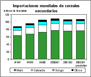 El comercio mundial de cereales secundarios en 2001/02 (julio/junio) se estima en 106 millones de toneladas, volumen semejante al del comercio mundial total de trigo. Si se confirma esta previsión, el comercio internacional de cereales secundarios sería casi 3 millones de toneladas menos que en la campaña anterior, que alcanzó un nivel sin precedentes. La mayor parte de esta contracción se debería a un descenso de las importaciones totales de los países en desarrollo a alrededor de 69 millones de toneladas. La merma del comercio mundial se debería principalmente a la reducción de las importaciones de maíz y sorgo, en 2,2 millones de toneladas y 500 000 toneladas, a 76 millones de toneladas y 8 millones de toneladas, respectivamente. Se prevé que el comercio de cebada se mantendrá en el nivel de la campaña anterior (alrededor de 18 millones de toneladas), mientras que se pronostica una disminución marginal de las importaciones de otros cereales secundarios importantes, como avena, centeno y mijo.