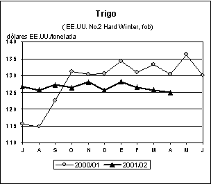 Desde que comenzó la actual campaña comercial en julio, los precios internacionales del trigo han cambiado muy poco de un mes para otro y se han mantenido dentro de una banda estrecha, si bien a niveles en general inferiores a los de la campaña anterior. Aunque durante los primeros meses de la campaña no se podían descartar algunos movimientos al alza en los precios, especialmente en vista de la disminución de la producción mundial en 2001 y del aumento de la demanda mundial de importaciones, las posibilidades de una recuperación sostenida se vieron muy comprometidas al llegar al mercado los excedentes imprevistos de algunos exportadores no tradicionales. En abril, el trigo No. 2 de los Estados Unidos (HRW, fob) alcanzó un promedio de alrededor de 125 dólares EE.UU. por tonelada, 3 dólares EE.UU. menos por tonelada que en enero y 5 dólares EE.UU. menos por tonelada que en el mes correspondiente del año pasado. En la Argentina, los precios para la nueva cosecha han mejorado un poco en los últimos meses. Pero las dificultades económicas, las incertidumbres respecto al tipo de cambio peso/dólar y los impuestos a la exportación introducidos últimamente no constituyen condiciones ideales para una recuperación sostenida de los precios de exportación en la Argentina.
