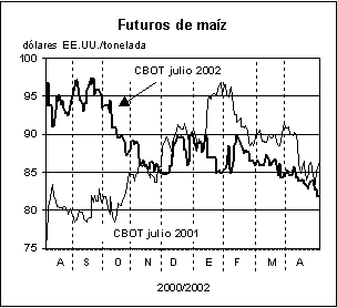 Los precios de exportación del maíz también han acusado el efecto de los abundantes suministros mundiales de exportación y de la débil demanda mundial de importaciones. Desde enero, los precios internacionales se han visto sometidos a una presión a la baja, debido a las abundantes exportaciones efectuadas por China y el Brasil. A esta altura del año, las condiciones meteorológicas cuentan mucho para el mercado, así como el volumen de las nuevas cosechas obtenidas en el hemisferio norte. Es así cómo en los últimos meses las perspectivas en general favorables para la producción han redundado en una fuerte disminución de los precios. En abril, el maíz No. 2 de los Estados Unidos (fob) alcanzó un promedio de 87 dólares EE.UU. por tonelada, 5 dólares EE.UU. menos por tonelada que en enero e igual que hace un año. Debido a las previsiones sobre la producción en 2002 y a la evolución de la demanda, en el CBOT los contratos a plazo del maíz para julio han estado por debajo de los niveles del año pasado. Sin embargo, como se prevé que la demanda mundial de maíz en 2002/03 excederá de la producción prevista, el déficit tendrá que cubrirse recurriendo a las existencias. La evolución de los precios dependerá del volumen total de suministros de exportación que tengan los grandes exportadores así como los exportadores no tradicionales.