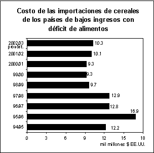 En base a los pronósticos más recientes relativos al comercio, la ayuda alimentaria y los precios de los cereales, se prevé que volverá a aumentar en 2001/02 la factura total de las importaciones de cereales que han de sufragar los países deficitarios en alimentos más vulnerables del mundo. Es probable que los países en desarrollo gasten alrededor de 23 000 millones de dólares EE.UU. por las importaciones de cereales en 2001/02, un 5 por ciento más que en la campaña anterior; mientras que en los países con bajos ingresos y con déficit de alimentos (PBIDA), la factura de las importaciones totales de cereales podría alcanzar los 10 000 millones de dólares EE.UU., un 9 por ciento más que en la campaña anterior. En base principalmente al aumento de las importaciones, los PBIDA harían frente a un incremento de más de 7 dólares EE.UU. por tonelada en sus importaciones de cereales por unidad a alrededor de 135 dólares EE.UU. por tonelada. Cifra todavía apreciablemente menor que los niveles de mediados de los años noventa cuando los precios de los cereales eran excepcionalmente altos. Según los primeros indicios, en 2002/03 la factura de las importaciones de los países en desarrollo volverá a aumentar por cuarto año consecutivo, situándose en casi 24 000 millones de dólares EE.UU. Este aumento se debería al incremento de las importaciones comerciales ya que se supone que los envíos de ayuda alimentaria y los precios internacionales de los cereales principales se mantendrán en los niveles de la campaña actual.