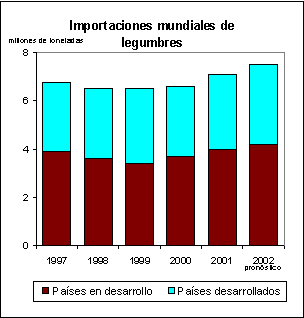 El comercio mundial de legumbres en 2002 se pronostica en unos 7 millones de toneladas, volumen ligeramente superior al de 2001. Es probable que el Asia meridional conserve su condición de principal región mundial importadora de legumbres destinadas al consumo humano. En Pakistán, se supone que los problemas con la producción interna redundarán en un aumento de las importaciones. También la India podría aumentar sus importaciones de legumbres, a pesar de la recuperación de su producción interna, ya que el incremento de los ingresos está estimulando el consumo. Es probable que este año la India reduzca las importaciones de guisantes amarillos, que en la campaña anterior aumentaron en respuesta a los altos precios internos de los garbanzos, debido a unas perspectivas mejoradas para el suministro interno de garbanzos. Las importaciones de guisantes secos de la China deberían de aumentar en 2002, tras la reciente decisión del gobierno de rebajar el impuesto al valor añadido aplicado a los guisantes forrajeros, de 17 por ciento a 13 por ciento, que es el que se aplica a otros productos forrajeros. Es probable que en 2002 aumenten las importaciones de los países del Cercano Oriente y de África del Norte para cubrir los déficit de producción previstos y también para atender la creciente demanda interna. Es probable que este año aumenten los envíos de ayuda alimentaria de legumbres al Afganistán. Pero podrían disminuir las compras de Egipto en base el ritmo lento de las importaciones en lo que va de este año. En África oriental y central, se supone que las emergencias y difíciles situaciones alimentarias que enfrentan algunos de los países aumentarán las importaciones de legumbres durante la presente campaña, principalmente en la forma de ayuda alimentaria. Se pronostica un aumento de las importaciones de frijoles secos de Sudáfrica en 2002, principalmente para compensar el descenso previsto de la producción interna. En América Latina y el Caribe, también se pronostica una disminución de las importaciones de frijoles secos por parte del Brasil y México, en base a unas perspectivas mejores para sus cosechas internas, mientras que podrían aumentar las de Cuba y Venezuela. En Europa, las importaciones de guisantes y lupinos secos de la CE probablemente aumentarán este año, debido principalmente a la prohibición de utilizar harinas de carnes y huesos en los piensos y también a la presencia de mayores disponibilidades en los mercados mundiales.
