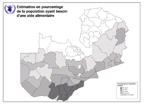 Le tableau 5 et la carte figurant ci-dessous indiquent les besoins d'aide alimentaire d'urgence des populations les plus touchées. Si ce sont les situations les plus préoccupantes et les besoins les plus urgents qui sont signalés, il ne faut pas oublier que la crise actuelle n'épargne pratiquement personne. La province du Sud, particulièrement touchée par l'irrégularité des précipitations et par les pertes de cultures qui en ont résulté, devrait être la première bénéficiaire de l'aide alimentaire.