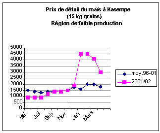 La figure 1 indique le régime pluviométrique de six des neuf provinces et souligne les précipitations tombées entre juillet 2001 et janvier ou mars 2002 et la moyenne à long terme. Dans la province du Sud (Livingstone), les précipitations ont été conformes à la normale jusqu'en décembre 2001, pour diminuer jusqu'à s'interrompre presqu'entièrement au mois de mars. La sécheresse a donc prédominé pendant la période de végétation et touché d'importantes zones de culture. C'est cette province qui a été le plus gravement touchée. Dans la province de l'Est (Lundazi), les pluies, normales jusqu'au mois de janvier, ont été suivies en février - mois crucial pour les cultures - d'une vague de sécheresse responsable d'une baisse importante des rendements. Dans la province de l'Ouest (Shesheke), le régime pluviométrique a été extrêmement instable. Les données disponibles s'arrêtent malheureusement à janvier 2002 et ne couvrent pas février et mars, deux mois pourtant décisifs pour les cultures. Dans la province du Centre (Kabwe), les pluies, satisfaisantes jusqu'en novembre, se sont considérablement réduites en décembre et en janvier.