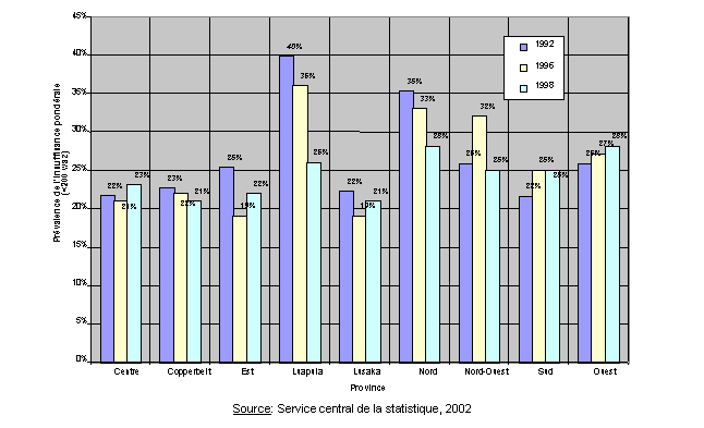 La figure 3 indique l'évolution de la malnutrition (< -2,00 waz) chez les enfants de moins de cinq dans chaque province. On constate que la prévalence recule dans les provinces de Luapala, du Nord, de la Copperbelt et du Nord-Ouest, augmente en revanche sensiblement dans les provinces du Sud et de l'Ouest, et fluctue dans les provinces du centre, de l'Est et de Lusaka. Les provinces du Sud et de l'Ouest ayant été particulièrement touchées par la mauvaise production de la dernière campagne, il importe de surveiller étroitement l'évolution de la situation nutritionnelle des mères et des enfants. La mission a constaté que, dans la plupart des villages, ce sont souvent les femmes qui, en cas de pénurie alimentaire, sont les dernières servies et par conséquent les plus touchées.