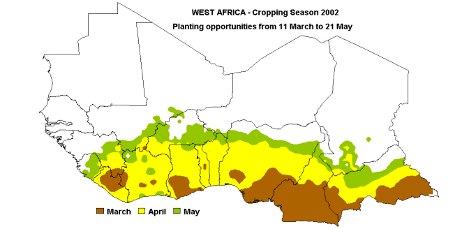 The map below shows the estimated planting time (opportunity) as defined by the dekad (10-day) satisfying the following requisites: during the first dekad, 25 mm of rainfall should be measured and a total rainfall of at least 20 mm should be recorded during the two next dekads. Data used for this analysis are from FAO field reports and RFE imagery.