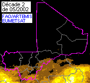 La campagne agricole a commencé dans le sud. Les premières pluies importantes ont été enregistrées dans l'extrême-sud au mois d'avril. Elles ont progressé vers le nord et étaient supérieures à la normale durant la première et la seconde décades du mois de mai, mais ont diminué pendant la dernière décade. Cependant, les précipitations étaient généralement adéquates en mai et l'imagerie satellitaire de la première décade de juin montre qu'elles se sont améliorées. La préparation des terres est en cours et les premiers semis de mil et de sorgho ont commencé dans le sud. Les pâturages ont commencé à se regénérer.