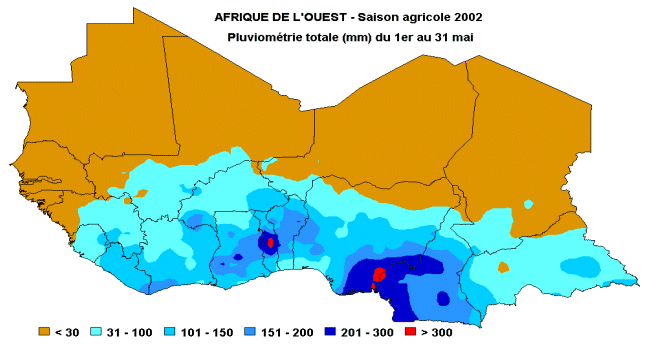 La première carte indique les quantités totales de pluies du 1er au 31 mai. Les données sont extraites de rapports de terrain de la FAO et de l'imagerie satellitaire d'estimation des pluies (RainFall Estimate - RFE) produite par le projet NOAA/USGS/FEWS/USAID. Les images RFE sont obtenues par interpolation de divers paramètres enregistrés au sol et de ceux obtenus grâce à des mesures de télédétection telles que : précipitations, humidité relative, vitesse du vent, altitude, températures des nuages froids.