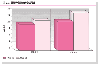 54. 粮农组织会议语言平衡的主要指标是使用5种官方语言会议的比例。使用4种或更多语言的会议有增加的趋势。使用5种语言的会议 从1998-99年度的9%增加到2000-01年度的12%,使用4种语言的会议比例略有增加,使用3种或两种语言的会议比上一个两年度有所下降 (图2.7和2.8)。