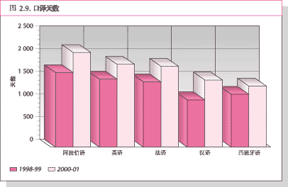 57. 在正式会议文件方面,2000-01年度粮农组织各种资料中每种语言的翻译字数都有 增加,总数达到2390万字,比1998-99年度的1860万字增加了28%。中文、阿拉伯文、西班牙文和法文分别增加71、48、15和11个百分点 (见图2.11)。