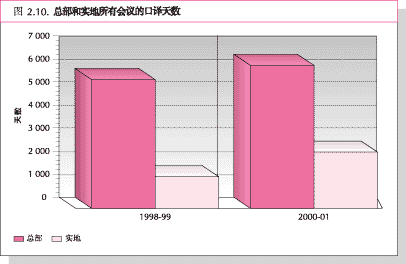55. 采用更多语言会议增加的趋势使本两年度 4世界粮农组织会议聘用的口译员时数大大增加。本两年度口译员以日计是8655天, 比上一两年度增加25%。如图2.9所示,中文增加比例最大(42%),顺次为阿拉伯语(27%),法语(24%),英语(21%)和西班牙语(15%)。 总部和实地的口译时数都有增加,而且有大量预算外会议(见图2.10)。