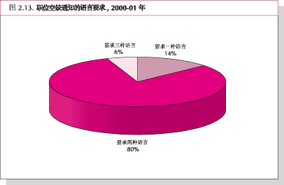 63. 语言与职位的总要求相关,P2以上的许多职位都要求至少两种语言。图2.13表明2000-01年度招聘的空缺专业职位中,86%要求两种或3种语言。强调新录用的职员的语言熟练程度,在新招收的职员任命确认时,可能要求对其进行有关正式语言(英语、法语、西班牙语、阿拉伯语或汉语)的熟练程度考试。对于现有职员,语言熟练程度是晋升的重要标准。