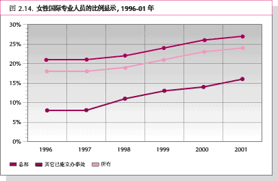 74. 专业人员之性别平衡。不断增加职业人员中女性的比例是粮农组织主要的人力资源政策目标之一。前三个两年计划的努力所 导致的结果是增加了总部专业岗位上的女性的比例,由1996年的21%增加到了2001年的27%;就所有岗位而言,则由18%增加到了24%(见图2.14)。 这些比例是根据总部及其它办公室6的固定岗位和续签合同岗位国际专业人员 的总人数而计算出来的。粮农组织罗马以外办公室的女性专业岗位的比例远远低于罗马总部女性专业岗位的比例。但是,其自身增长率还是比较大 的,由1996年的8%增加到了2001年的16%。
