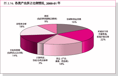 82. 各类产出交付的分布情况见图2.16。对成员国的直接咨询和实地计划支持占总产出的22%,研究和分析及信息占18%,协调和信息交流占16%以及方法和准则占14%。其它各类产出从 培训的9%到国际约定、协定/公约和标准的3%不等。