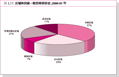90. 如图2.17所示,非洲是2000-01两年度接受培训援助最多的区域,占37%。亚太和拉丁美洲及加勒比分别接受培训活动的24%和21%, 而近东及北非和欧洲各占总量的大约11%和7%。