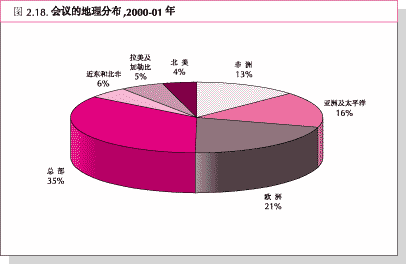 91. 组织专家磋商会和其它会 议乃很多类别产出的一重要成分,特别是协调和信息交流、编制方法和准则以及支持国际约定和协定这些方面。过去,会议被列为一个单独的产 出类别,但意识到会议通常是实现某项产出的一种手段而非产出本身,2000-01年未继续将它作为一个产出类别。然而,考虑继续报告会议地点的分 布情况还是有用的,如图2.18所示。粮农组织总部经常是人们喜爱的会议地点,因为它使后勤更为简单,并确保有效的秘书处支持。在2000-01两年 度内35%的会议在总部召开。欧洲是21%的会议的会址,其次是亚太16%,非洲13%。