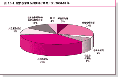457. 1996-97年以来,实地计划交付额逐步增长, 2001-02两年度达到6.872亿美元,比1998-99年增24%(表3.3-1)。然而,这主要是因为紧急援助量增加,伊拉克石油换食品计划增加约70%,2000-01年达到2.49亿美元。其它特别救济活动增加将近3倍从1998-99两年度的2720万美元至7630万美元。其它一些领域的交付也有增长,特别是单边信托基金增长22%至4810万美元。从总体看,实地计划的非紧急部分2000-01年下降约5%,比起1998-99年14%的下降有了极大的改进。
