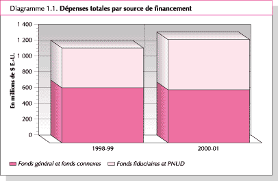 1. Comme indiqué dans l'avant-propos du Directeur général, l'Organisation s'est efforcée d'exécuter son programme de travail approuvé dans le même climat d'austérité que précédemment. Les crédits du Programme ordinaire sont restés inchangés à 650 millions de dollars E.-U., ce qui équivaut à une diminution en termes réels. Comme indiqué dans le Diagramme 1.1, les dépenses totales ont augmenté d'environ 9 pour cent, passant de 1 200 millions en 1998-99 à 1 304 millions de dollars E.-U. en 2000-01. Ce résultat est dû essentiellement à l'augmentation de 150 millions de dollars E.-U. de l'aide d'urgence, de 100 millions de dollars E.-U. au titre du Programme pétrole-contre-vivres pour l'Iraq et de 50 millions de dollars E.-U. liés à d'autres opérations spéciales de secours. Cela a contribué à une hausse de 25 pour cent des dépenses au titre des fonds fiduciaires et du Programme des Nations Unies pour le développement (PNUD). Les dépenses au titre du fonds général et des fonds connexes, qui incluent les crédits du Programme ordinaire et les remboursements liés aux activités d'investissement co-financées et aux dépenses d'appui, ont diminué de quelque 4 pour cent.