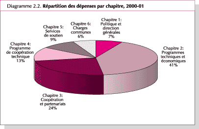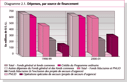 22. En 2000-01, les dépenses totales ont atteint 1 304 millions de dollars E.-U., soit une hausse de 105 millions de dollars E.-U. (8,7 pour cent) par rapport à 1998-99. Les dépenses totales des deux derniers exercices biennaux sont illustrées par le diagramme 2.1.