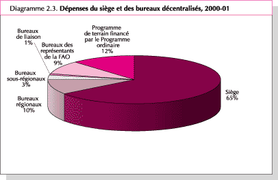 33. Le ratio des dépenses de 2000-01 du programme de terrain aux dépenses du programme de travail financé par le Programme ordinaire pour le Chapitre 2: Programmes techniques et économiques, est indiqué dans le Tableau 2.4. Globalement, les dépenses du programme de terrain ont été plus de deux fois supérieures à celles du programme de travail. Toutefois, il existe d'importantes différences entre les Grands Programmes. Ainsi, le Grand Programme 2.1: Production agricole et systèmes de soutien, a représenté à lui seul 70 pour cent des dépenses totales du programme de terrain pour 2000-01 et a enregistré le ratio le plus élevé, avec des dépenses du programme de terrain plus de cinq fois supérieures à celles du programme de travail. On notera, toutefois, que ce ratio tomberait à 2,5 si le programme pétrole-contre-vivres en faveur de l'Iraq était exclu. Le Grand Programme 2.4: Forêts a également enregistré un ratio relativement élevé de 2,1. En revanche, les dépenses du programme de terrain pour le Grand Programme 2.2: Politiques et développement alimentaires et agricoles n'ont atteint qu'un tiers environ de celles du programme de travail. Le ratio est également inférieur à 1 pour le Grand Programme 2.3: Pêches.