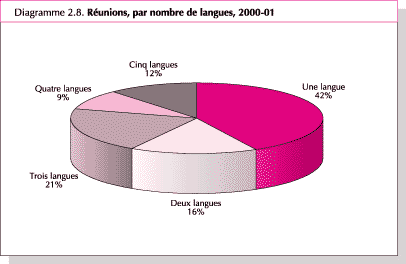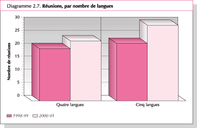 54. Le principal indicateur de l'équilibre linguistique pour ce qui est des réunions de la FAO est le pourcentage de réunions tenues dans les cinq langues officielles. On constate une tendance à l'augmentation du nombre de réunions tenues dans quatre langues ou plus. En 2000-01, le pourcentage de réunions tenues dans les cinq langues de l'Organisation est passé à 12 pour cent, contre 9 pour cent en 1998-99. Le pourcentage de réunions tenues dans quatre langues a légèrement augmenté, tandis que l'on constate un déclin du pourcentage de réunions tenues dans trois ou deux langues en 1998-99 et 2000-01 (Diagrammes 2.7 et 2.8).