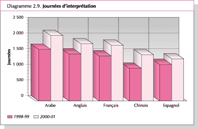 55. La tendance à utiliser davantage de langues dans les réunions a entraîné une augmentation sensible du nombre de journées d'interprétation assurées pour des réunions de la FAO pendant l'exercice biennal4. Le nombre total de journées d'interprétation enregistré pour l'exercice biennal s'élève à 8 655 jours, soit une augmentation de 25 pour cent par rapport à l'exercice 1998-99. Comme indiqué dans le Diagramme 2.9, l'augmentation la plus conséquente concerne le chinois (+42 pour cent), suivi de l'arabe (+27 pour cent), du français (+ 24 pour cent), de l'anglais (+21 pour cent) et de l'espagnol (+15 pour cent). Le nombre de journées d'interprétation a augmenté tant au siège que sur le terrain, où un certain nombre de réunions ont été financées grâce à des ressources extrabudgétaires (Diagramme 2.10).