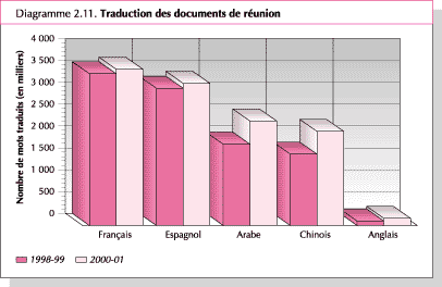 57. En ce qui concerne la documentation officielle des réunions, on constate une augmentation sensible pendant l'exercice 2000-01 du volume de la traduction dans chacune des langues et pour tous les types de produits de la FAO. Au total, 23,9 millions de mots ont été traduits, soit une augmentation de 28 pour cent par rapport aux 18,6 millions de mots traduits en 1998-99. L'augmentation du nombre de mots traduits se chiffre, pour le chinois, l'arabe, l'espagnol et le français, à 71, 48, 15 et 11 pour cent, respectivement (Diagramme 2.11).