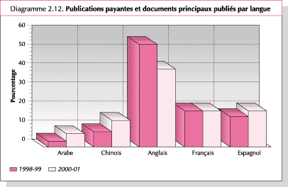 60. Au cours de l'exercice biennal, le pourcentage de publications de la FAO parues en arabe, en chinois et en espagnol a sensiblement augmenté (Diagramme 2.12). En 1998-99, 54 pour cent de toutes les publications payantes et des documents principaux ont été publiés en anglais; ce pourcentage est tombé à 41 pour cent en 2000-01. Le pourcentage de publications en français est resté constant à 19 pour cent, celui des publications en espagnol est passé de 16 à 19 pour cent, en arabe de 3 à 7 pour cent et en chinois de 8 à 14 pour cent, du fait essentiellement de l'Accord passé avec l'Académie chinoise des sciences agricoles. Les progrès dans ce domaine ont été réalisés grâce au crédit budgétaire spécial alloué à cette fin au milieu de l'année 2001.