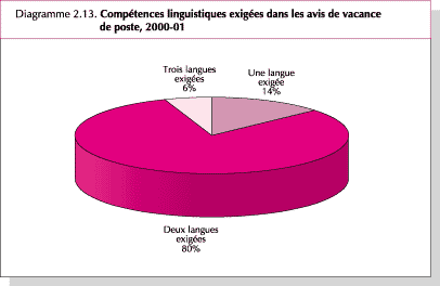 63. La connaissance des langues fait partie des qualifications exigées des candidats à un poste à la FAO. Pour la plupart des emplois de classe supérieure à P2, un minimum de deux langues est indispensable. Le Diagramme 2.13 montre que 86 pour cent des avis de vacance de poste du cadre organique publiés en 2000-01 exigeaient la connaissance de deux ou trois langues. L'Organisation met traditionnellement l'accent sur les compétences linguistiques au moment du recrutement. Elle se réserve le droit de soumettre les fonctionnaires nouvellement recrutés à un test d'aptitude linguistique dans les langues officielles pertinentes, à savoir, l'anglais, l'arabe, le chinois, l'espagnol ou le français. Pour de nombreux fonctionnaires en poste, les compétences linguistiques sont désormais un critère important de promotion.