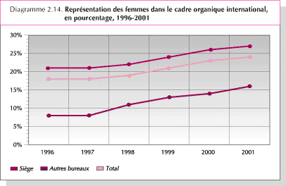 74. Ventilation du personnel féminin et masculin: personnel du cadre organique. En matière de politiques liées aux ressources humaines, l'augmentation du nombre de femmes fonctionnaires du cadre organique est l'un des principaux objectifs de l'Organisation. Les dispositions prises en ce sens au cours des trois derniers exercices biennaux ont permis d'augmenter le nombre de femmes occupant des postes du cadre organique au siège de 21 pour cent en 1996 à 27 pour en 2001 et, tous lieux d´affectation confondus, de 18 à 24 pour cent (Diagramme 2.14). Ces chiffres ont été calculés pour le total des fonctionnaires internationaux du cadre organique ayant des contrats à durée déterminée ou de caractère continu au siège ou dans des Bureaux extérieurs6. Alors que le pourcentage de femmes occupant des postes du cadre organique dans les bureaux extérieurs de la FAO est nettement inférieur à celui du siège, leur nombre augmente à un rythme relativement soutenu, puisque le pourcentage est passé de 8 pour cent en 1996 à 16 pour cent en 2001.