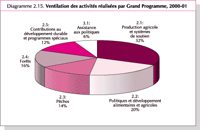 81. C'est le Grand Programme 2.1: Production agricole et systèmes de soutien qui a réalisé le plus grand nombre de produits - avec 32 pour cent du total indiqué dans le Diagramme 2.15. Il a assuré 49 pour cent des produits correspondant à la rubrique méthodologies et directives, 39 pour cent à la rubrique coordination et échange d'informations et 37 pour cent à la rubrique de formation. Le Grand Programme 2.2: Politiques et développement alimentaires et agricoles a assuré 20 pour cent de l'ensemble des produits, le Grand Programme 2.4: Forêts, 16 pour cent, le Grand Programme 2.3: Pêches, 14 pour cent et le Grand Programme 2.5: Contributions au développement durable et programmes spéciaux, 12 pour cent. Si le Grand Programme 3.1: Assistance aux politiques n'a représenté que 6 pour cent de la totalité des produits, il a toutefois assuré 16 pour cent des produits concernant l'appui aux États Membres et au terrain.