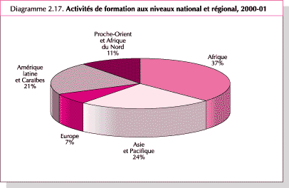 90. Comme indiqué dans le Diagramme 2.17, l'Afrique a été le principal bénéficiaire de l'assistance en matière de formation en 2000-01 avec 37 pour cent de ces produits. L'Asie et le Pacifique et l'Amérique latine et les Caraïbes arrivent aux deuxième et troisième rangs avec 24 pour cent et 21 pour cent respectivement, tandis que le Proche-Orient et l'Afrique du Nord ainsi que l'Europe ont bénéficié respectivement de 11 pour cent et de 7 pour cent du total.