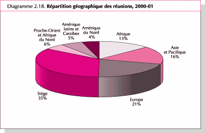 91. L'organisation de consultations d'experts et d'autres réunions est un élément essentiel de nombreux types de produits, particulièrement la coordination et l'échange d'informations, la préparation des méthodologies et des directives et le soutien aux engagements et accords internationaux. Dans le passé, les réunions constituaient une catégorie de produits distincte mais, après avoir considéré qu'une réunion constitue généralement un moyen pour réaliser un produit plutôt qu'un produit en soi, on a abandonné cette formule en 2000-01. Toutefois, il paraît utile de continuer à rendre compte de la répartition des réunions par zone géographique, comme indiqué dans le Diagramme 2.18. Le siège de la FAO est souvent préféré pour les réunions, pour des raisons de logistique et à cause des services de secrétariat efficaces qu'il assure. Pendant l'exercice 2000-01, 35 pour cent des réunions se sont tenues au siège. La région Europe a accueilli 21 pour cent des réunions, la région Asie-Pacifique, 16 pour cent et la région Afrique, 13 pour cent.