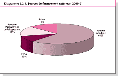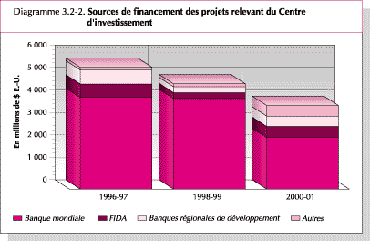 445. Le montant du financement fourni par le FIDA et les banques régionales de développement a augmenté par rapport à 1998-99, mais le total des engagements de la Banque mondiale est tombé de 4,0 milliards de dollars E.-U. en 1998-99 à environ 2,3 milliards en 2000-01 (Diagramme 3.2-2).