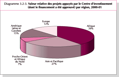 451. Le tableau 3.2-4 illustre l'évolution de la répartition par région des projets dont le financement a été approuvé en 2000-01. Le pourcentage de projets en Afrique est demeuré constant (39 pour cent en 2000-01) tandis que celui des projets au Proche-Orient et en Afrique du Nord est tombé de 11 à 7 pour cent et en Europe de 17 à 12 pour cent. Le pourcentage de projets approuvés en Amérique latine et dans les Caraïbes est passé de 18 à 23 pour cent et, dans la région de l'Asie et du Pacifique, de 14 à 19 pour cent.