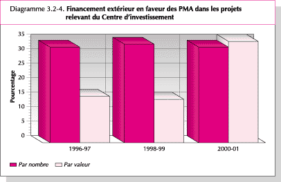 453. Les engagements de financement extérieur pour les pays les moins avancés (PMA) ont nettement augmenté, leur proportion passant de 15 pour cent en 1998-99 à 35 pour cent en 2000-01. Cette augmentation a été due en partie à l'inclusion des projets PSSA et PCT, qui n'entraient pas en ligne de compte dans les exercices précédents. En outre, l'APD a diminué de manière plus marquée dans les autres pays que dans les PMA. Le nombre de projets financés pour des PMA est passé de 26 à 30, mais leur proportion continue de représenter à peu près un tiers du total (diagramme 3.2-4).