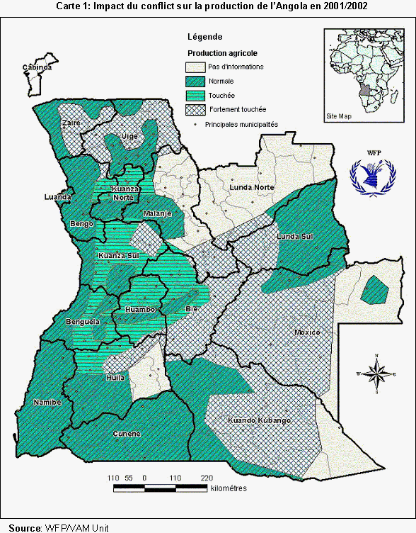 Une mission FAO/PAM d'évaluation des récoltes et des approvisionnements alimentaires s'est rendue en Angola du 15 mai au 6 juin 2002 pour estimer, comme lors des années précédentes, la production agricole de 2002 et les besoins d'importation de céréales - aide alimentaire y compris - pour la campagne de commercialisation 2002/2003 (avril/mars). Après quelques séances d'information organisées par le Ministère de l'agriculture et du développement rural (MINADER), la mission a visité, sur une période de deux semaines, 10 des 18 provinces du pays. Des responsables de l'Unité de sécurité alimentaire du MINADER et des observateurs de la Communauté du développement de l'Afrique australe (SADC) et de USAID se sont joints à elle.